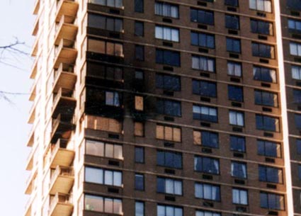ところが、間もなく、多分1分もたっていないだろう、外から消防車のけたたましいサイレンの音が響いてきた。まさか、と思いつつ窓を開ける。ふと見上げると、まさに斜め上の部屋、19-Dの窓から、灰色の煙がもうもうと吹き出しているではないか。瞬時に鼓動が高まるのがわかった。なぜ、よりによってこんな日に、しかもこんな間近な部屋で火災が発生するのか。わたしの部屋は18-C。相当近い。このアパートメントは52階建てで、少なくとも600世帯はあるのに、運が悪すぎる。