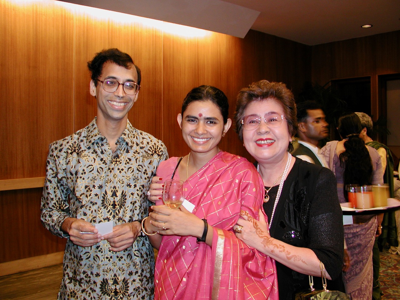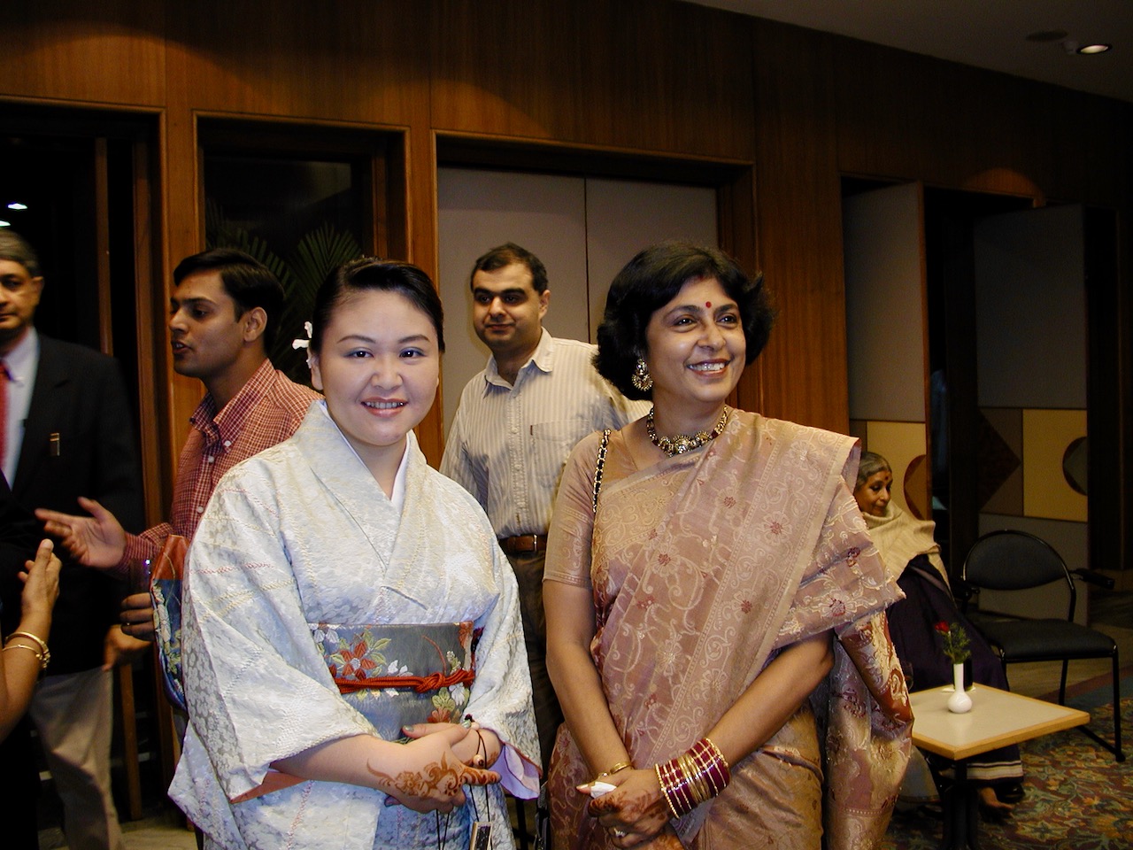 義継母ウマも、とてもお洒落。落ち着いた色合いのサリーがお似合いだ。妹は着物で出席。