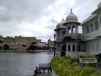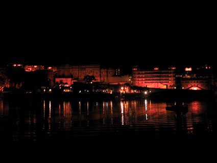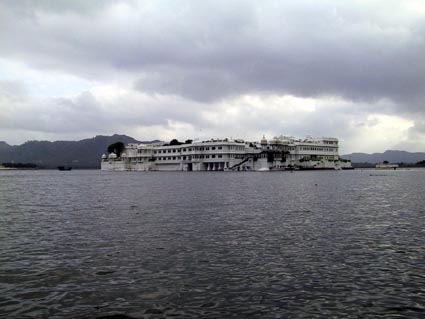 ウダイプールの人造湖、ピチョーラー湖に浮かぶレイク・パレス・ホテル。マハラジャの夏の離宮をホテルに改装したらしい、007の舞台にもなったことのあるホテルで、映画では湖にワニが登場していた。湖畔からホテルまでは専用のボートに揺られて行き来する。