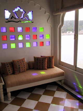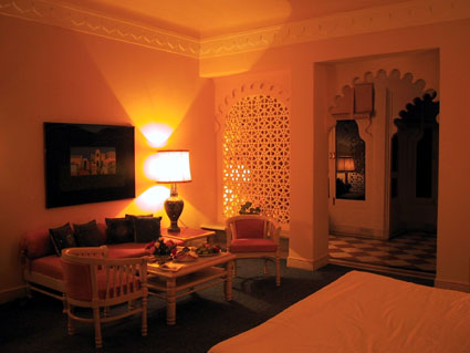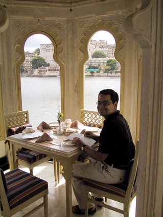 ここには人工湖があり、その中心に、かつてマハラジャの夏の離宮だったゴージャスなホテルがある。たまたま披露宴に来ていた人が、このホテルのマネージャーだったらしく、スタンダードルームを予約していたのに、スイートルームに変えてくれた。