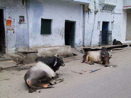 ウダイプールの町へ出る。この町でも牛が主役。ニューデリーにも牛がいっぱいいたのよ~。写真は載せなかったけれど。道路の中央分離帯とかにも牛がいて、牛が突然動き出すと、車が急ブレーキかけたりして、危ないのなんの。