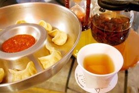 メニューには、チベット風の餃子「モモ」もある。紅茶とモモの組み合わせはユニークだ。どんなものだろうかと、一皿を注文することにした。