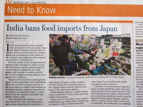 インド保健・家族福祉省は声明で「日本からの食品輸入を即時停止する」とし、輸入禁止の期間は「3カ月、または放射性物質の危険性が許容範囲まで低下したとの信用に足る情報が得られるまで」としている。