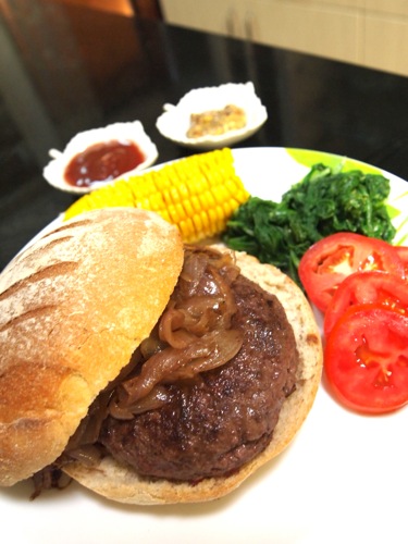 こちらはビーフバーガーだ。夫がウィンブルドンの観戦中につき、TVディナーを所望したため、妻は特別の計らいで食べやすいハンバーガーを作った。