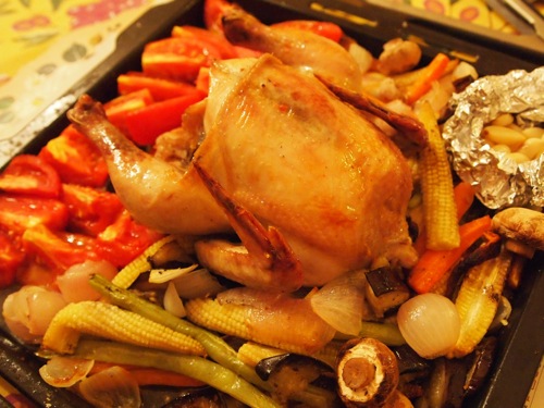 こちらも毎度おなじみ、鶏の丸焼き。有り合わせの野菜(だけど玉ねぎは必須)を敷いて、全体に塩胡椒とオリーヴオイルで味付け、塗り塗り塗り込んで、オーヴンにいれるだけ。