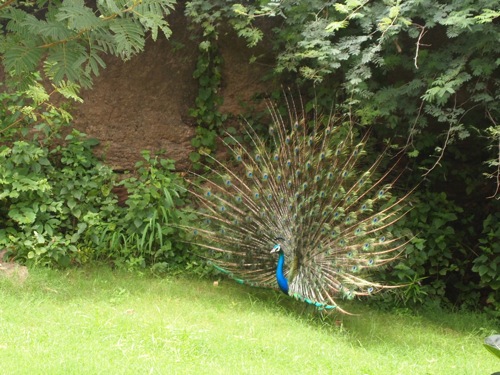 車窓から、緑豊かな庭園を眺めていると、クジャクが羽根を広げている!!