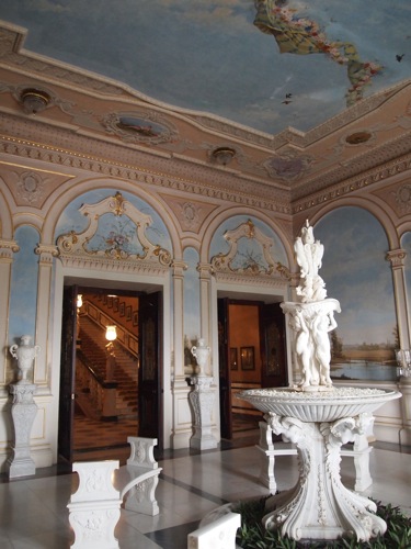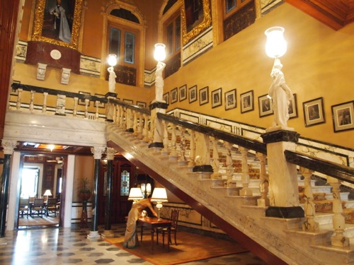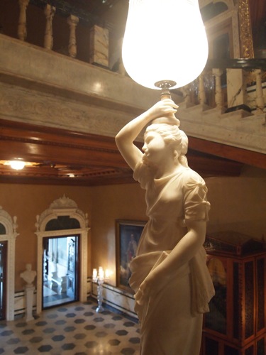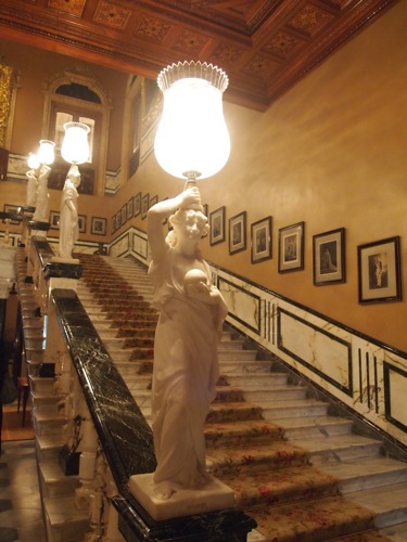 このマーブルの階段が伸びるホールがまた、すてき。支柱の上に並ぶ彫像は、紛れもなくミューズ!