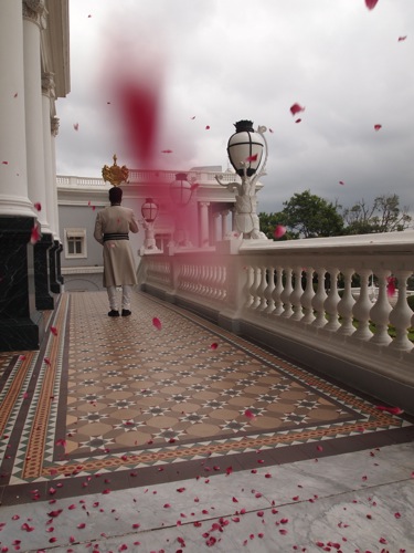 ニザームはじめ、貴賓たちを歓迎するときと同様の様式で、我々ゲストをホテルへ誘ってくれる。階段を上がったところで、空からバラの花びらが降って来るではないか!