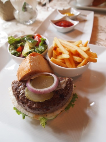 たとえばこのハンバーガー。ご丁寧に半分に切られているのがお分かりだろうか。かつて食べたことがないような、滑らかな挽肉の、実に上品なビーフバーガーであった。