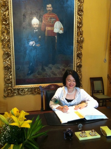 ところで、ここはニザームの書斎。デスクにゲスト・ブックが置かれていたので、孔雀の羽根の万年筆でメッセージを残しているところ。