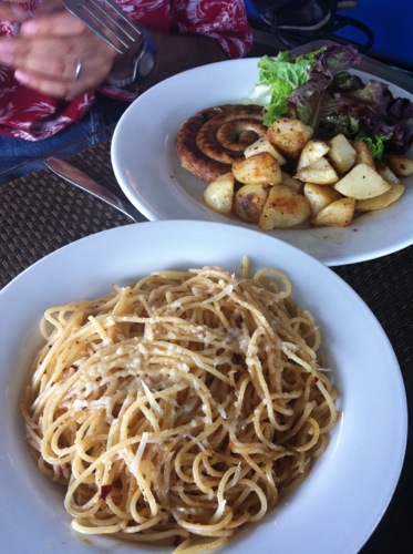 ビーフは思ったほどの味ではなかったが、やはりかたつむりなソーセージは美味だった。家庭的なペペロンチーノもおいしかった。