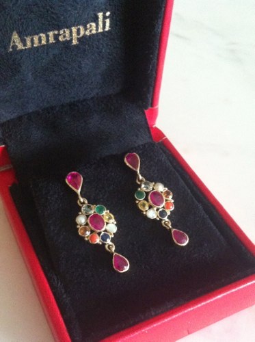 と、これは! と思えるイアリングを発見。ナブラトナ・ストーンズがあしらわれた、かわいらしいイアリングだ。たいてい、ごっついデザインのものが多いのだが、これはかつて見たことのない上品さだ。約5年前に購入した指輪も同じAMRAPALIのものだから、お揃いになる。