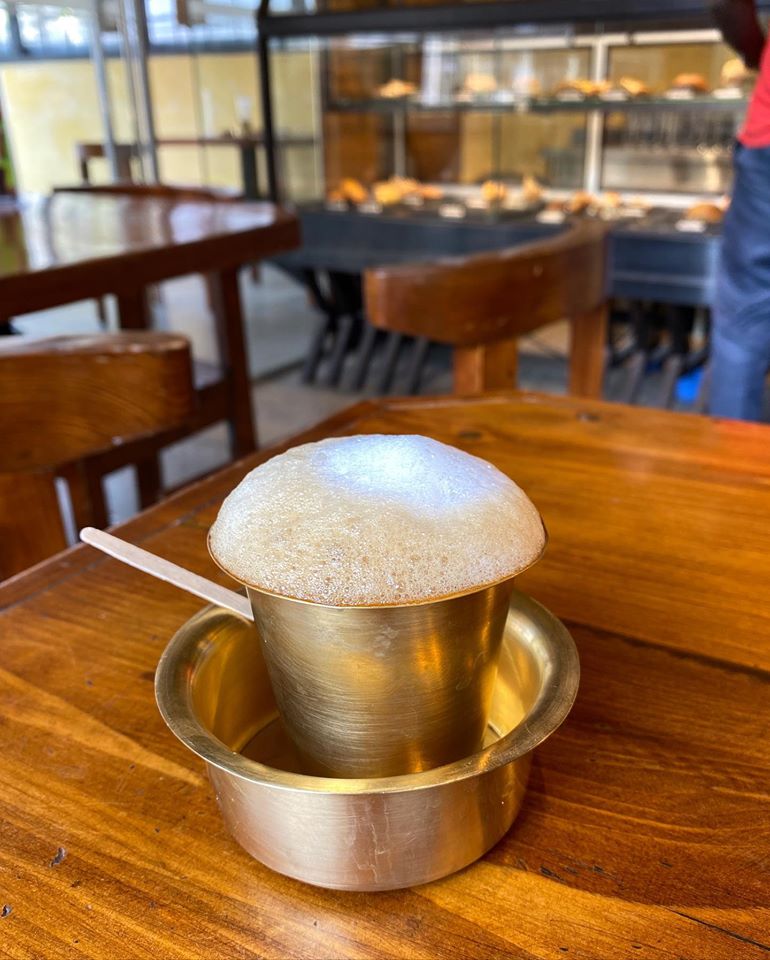 ちなみにサウスインディアン・コーヒーを試せる場所は大きく3つのカテゴリーに分けられる。昔ながらのローカルな味わいを体験するなら、ドーサやイディリ、ワダといった、典型的な南インドの朝食が楽しめるローカル食堂で。この場合、コーヒー豆は廉価なものが用いられており、カサを増すためにチコリが配合されている場合もある。それはそれで、砂糖をたっぷり入れて飲むと風味も増し、独特の味わいがある。次に、既述の「温故知新」系のカフェ。こちらはコーヒー豆の品質も比較的よく、モダンな店内で伝統的なコーヒーを味わえる。