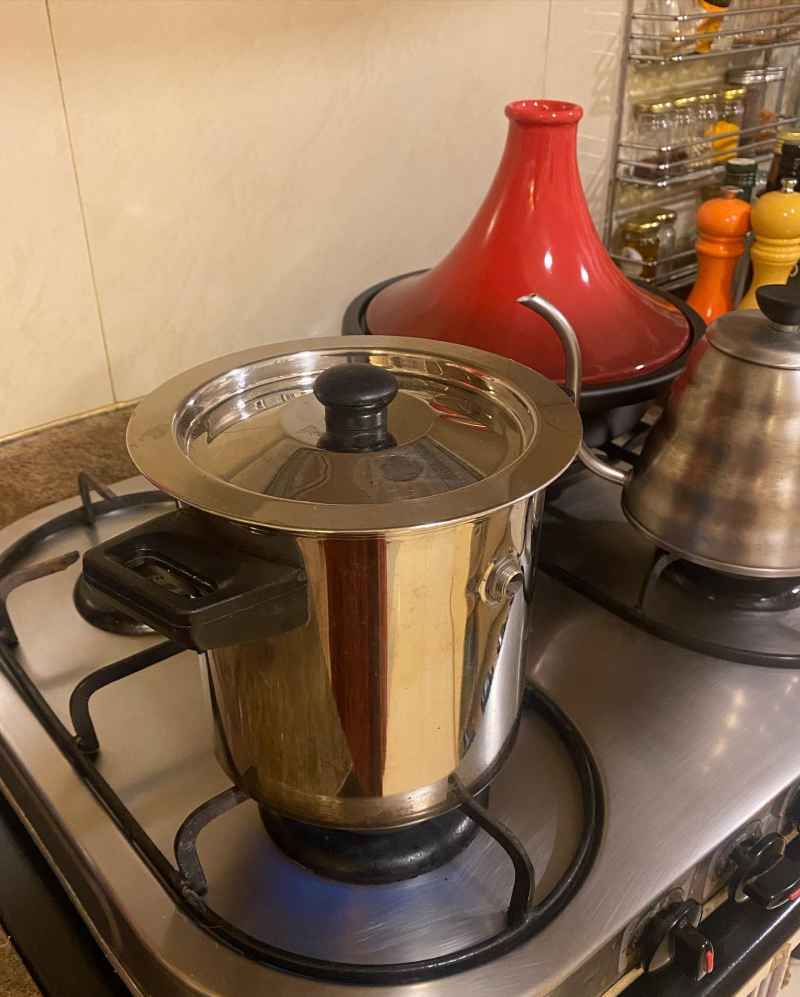 ⬆写真の鍋は、ミルク煮沞甚。二局匏になっおいお、泚ぎ口から氎を入れ、本䜓に牛乳を泚ぐ。倖偎の氎が沞隰するず、その際にホむッスルが鳎るので、吹きこがれを防ぐこずができるずいう優れものだ。詳しい䜿甚法は、䞋郚の動画むンドでの健康管理免疫力を高めようで説明しおいる。