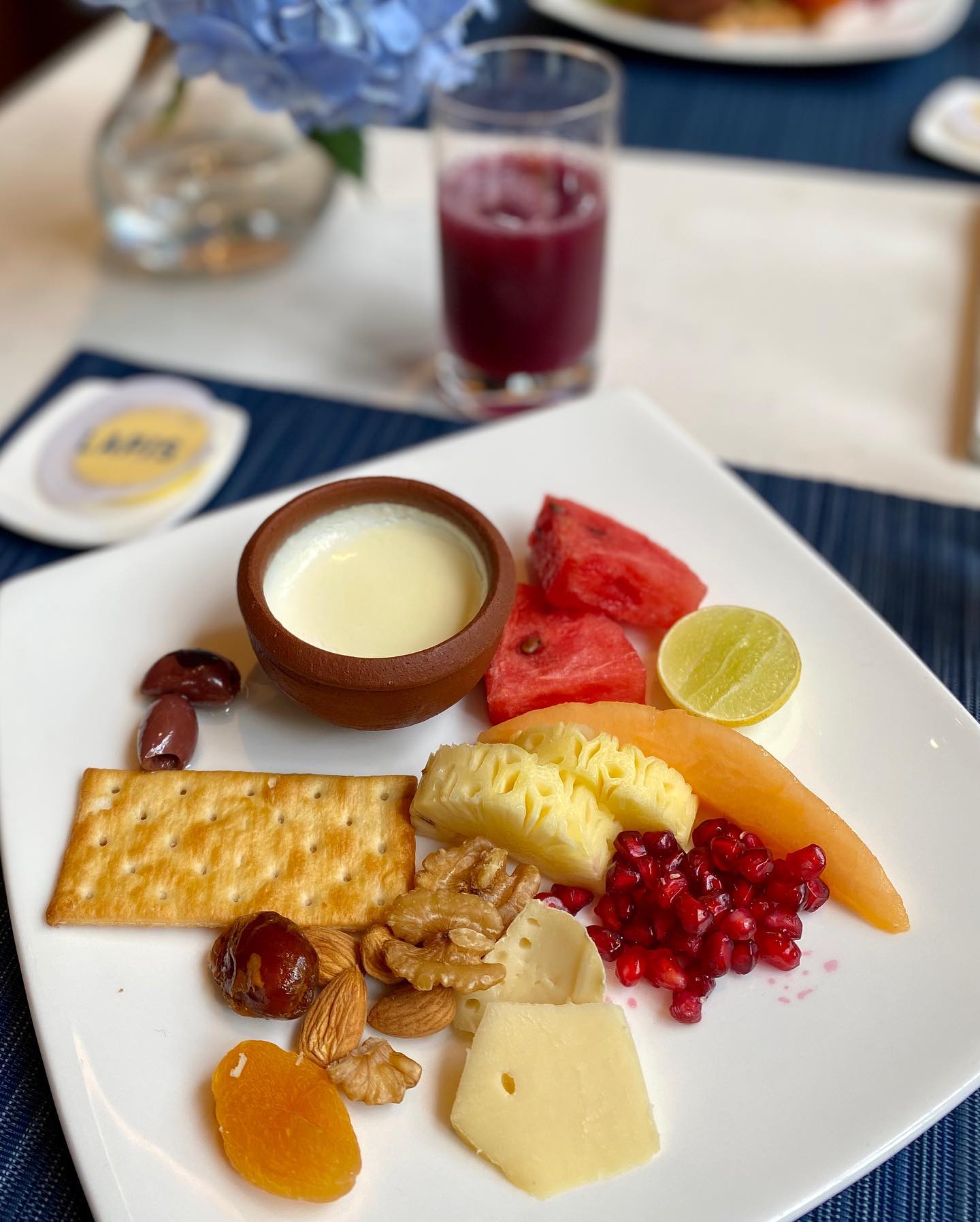 ⬆高玚ホテルの朝食ブッフェの䞀䟋。前日に仕蟌たれた玠焌き入りのペヌグルト。衚面がクリヌム状になっおいるのがいい。