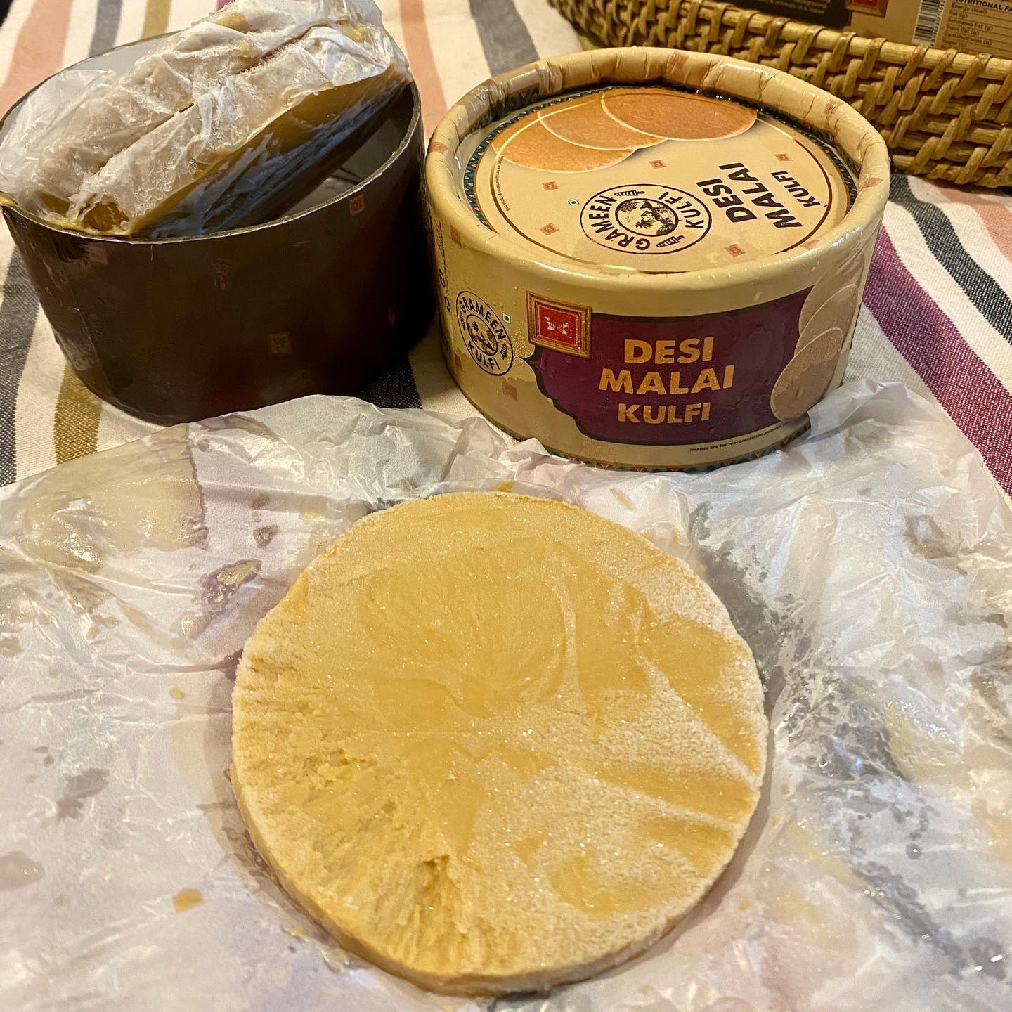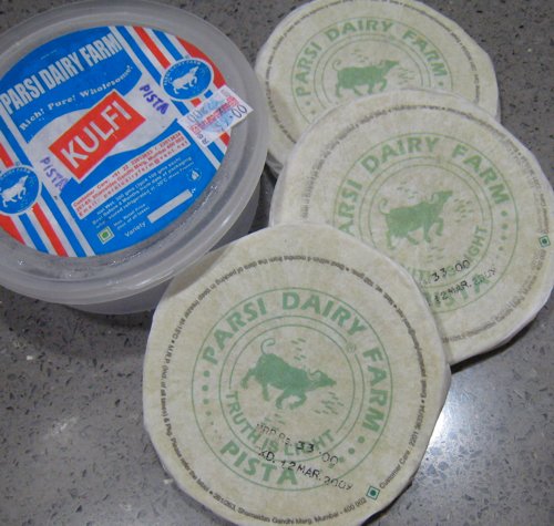 ⬆10幎以䞊前の写真。ムンバむにあるPARSI DAIRYの円盀型クルフィヌむンドのアむスクリヌム 。ミルキヌで濃厚で、ひたすらおいしい。