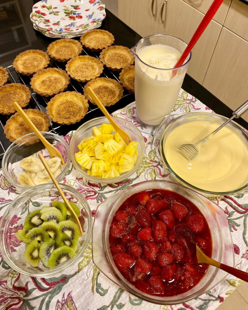 ⬆か぀お、ミュヌズ・クリ゚むションの週に䞀床の集いでは、十数名から倚い時では30名以䞊が集たっお掻動しおいた。毎週のように、お菓子などを準備しおいたあの情熱はなんだったか。これはカスタヌドクリヌムず生クリヌムが決めおなフルヌツタルト。