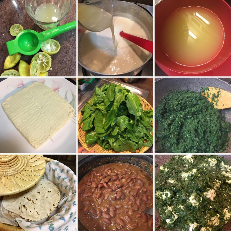 ⬆自家補パニヌルでのむンド料理䜜り。Nilgiri’sのFull Cream Milkを沞隰させ、レモン汁を加えお牛乳を凝固させおパニヌルチヌズを䜜る。牛乳を分離させお濟したあずの乳枅は、チャパティを䜜るずき、ATTA無粟補の党粒小麊粉に加える。するず生地がもっちり柔らかくなる。