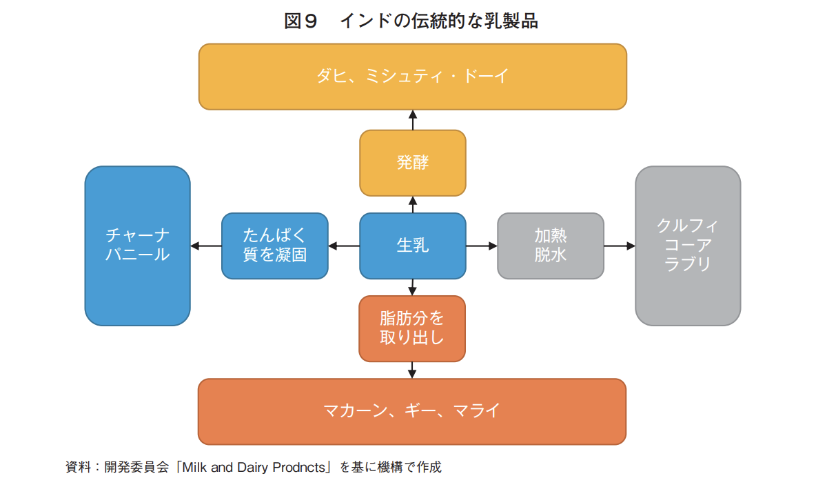 むンドの牛乳は、沞隰させおレモンを加え分離させればパニヌルカッテヌゞチヌズが䜜れるし、煮沞埌の䞊に浮かんだクリヌムは「生クリヌム」ずしおも䜿える。生クリヌムを攪拌し続けるずバタヌにもなる。
