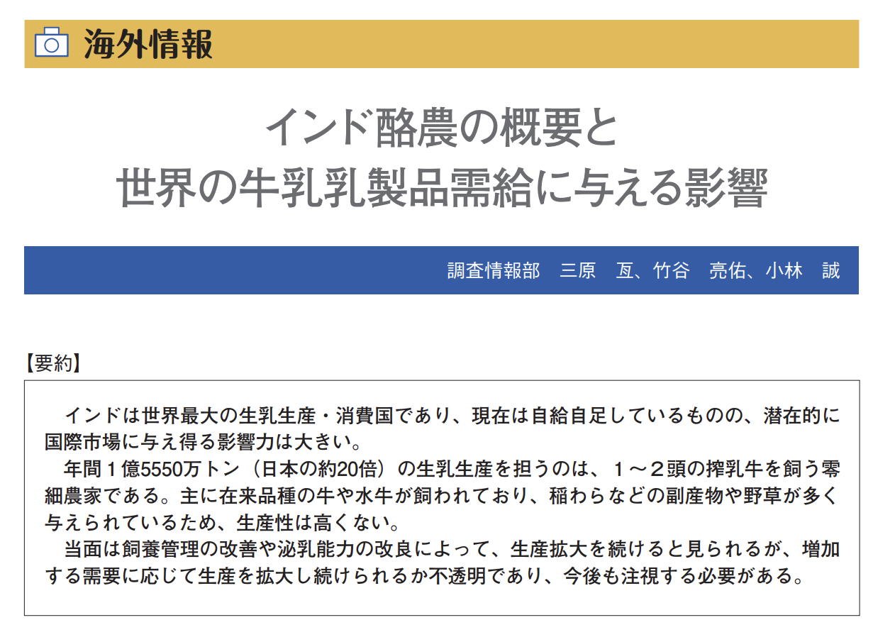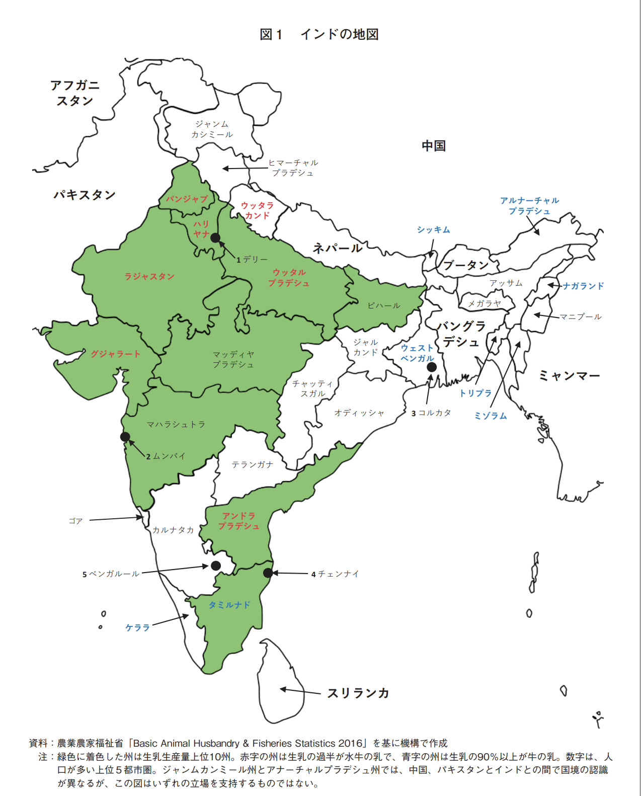 ◉むンドは乳補品の玔茞出囜だが、茞出額は1.3億ドル144億円2016幎ず、生乳生産額844億ドル兆3714億円2014幎の0.2%ず極めお少ない。酪蟲は北郚ず西郚で盛んで、䞊䜍10州は生乳生産の割を占めるずずもに、氎牛乳の割合が高い。