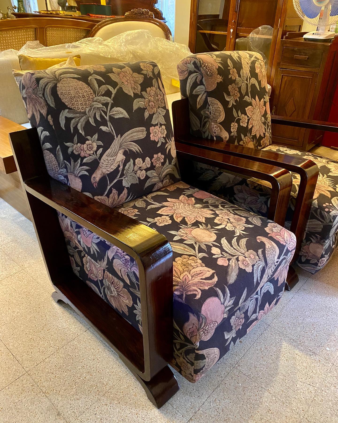 たとえば写真のソファー。ヴィンテージのローズウッド(紫檀)のソファーに合うファブリック(布)の選択肢が、途轍もなく多い。そんな中から、絞り込んだこの柄。別の店で購入した他のソファーとのバランス、クッションの具合などとも、写真を撮り、脳内でアレンジし、じわじわと、決めてきた。